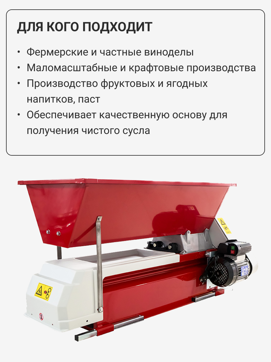 Дробилка "Rondinella" является лучшим выбором для виноделов, которые стремятся сделать процесс производства вина максимально комфортным, а качество гарантированно высоким. Удобство в обслуживании и надежность узлов сделает эту машину Вашим надежным помощником на долгие годы!